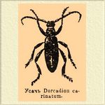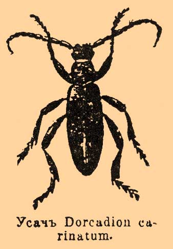 Для предохранения деревянных частей построек, телеграфных столбов, шпал и т. п. пропитывают дерево хлористым цинком. Другой вид Cl. rusticus вредит тополям и осинам в южной России. — Род Tetropium имеет нитевидные усики, равные по длине половине тела; грудной щит округленный; бедра сильно утолщены; тело уплощенное, Т. luridum черного цвета с красновато-бурыми надкрыльями и красновато-желтыми ногами и усиками 10 — 16 мм длины. Встречается в средней Европе, в северной и средней России, в Крыму и во всей Сибири. Самки, летающие в июне, откладывают яйца на старые ели, реже на сосны и лиственницы (или на недавно срубленные стволы или на здоровые деревья). Личинки делают ходы сначала под корой, а затем в древесине и окукливаются следующей весной. Голова белых личинок — сердцевидная, верхняя губа полукруглая, верхние челюсти с 2 зубцами, глаз нет, все тело личинок покрыто короткими волосками. Этот жук один из самых вредных для хвойных лесов, так как пораженные им деревья отмирают очень быстро; для уничтожения его выкладываются ловчие деревья, кора которых сжигается, пока личинки еще не успели углубиться в древесину. Вред от жука был замечаем в Германии и в России (Московская, Владимирская, Симбирская губ.). — О роде Callidium см. Хитрец. — Род Cerambyx, заключающий крупных жуков, имеет щетинковидные усики, которые у самцов длиннее тела, а у самок — длиною с тело; грудной щит с острыми шипами по сторонам, надкрылья длинные, у основания вдвое шире грудного щита. С. heros блестяще-черного цвета с суженными кзади надкрыльями, черными в передней части и красно-бурыми сзади; покрыты с брюшной стороны шелковистыми сероватыми волосками длиной 28 — 50 мм. Живет в средней и южной Европе (в России на юге). Жуки летают в июне и в июле; личинки до 3 дюймов длины, истачивают древесину дубов, а также ясеней и орешника, чем приносят значительный технический вред, против которого надежных мер неизвестно. Сюда относится еще целый ряд У., приносящих более или менее значительный вред различным деревьям, как Hylotrupes bajulus (личинки в мертвой древесине хвойных деревьев, а также в балках, мебели, деревянной посуде и т. п.), Aromia moschata (издающие мускусный запах, личинки в ивовых стволах), Prionus coriarius и Ergates faber (в гнилой древесине различных деревьев), Rhagium mordax и Rh. inquisitor (под корой мертвых лиственных деревьев) и Rh. indagator (под корой мертвых хвойных деревьев), виды рода Leptura (личинки в гнилой древесине различных деревьев). — Из подсемейства Lamiitae следует отметить следующие роды и виды. Lamia с толстыми щетинковидными усиками, которые короче тела; длина надкрыльев вдвое больше их совокупной ширины. Весьма распространенный по всей Европе вид L. textor (дровосек-ткач), матово-черного цвета с тонкими бурыми волосками, надкрылья зернистые с желтоватыми точками и крапинками, длиной 20 — 30 мм. Летает в июне и июле и откладывает яйца на иве и тополе, в древесине которых живут его личинки (до 4 см длиной), попадающиеся иногда и в подземных частях этих деревьев. — Род Astynomus характерен весьма длинными усиками, которые в 5 раз длиннее тела у самца и в 2 раза у самок; длина надкрыльев вдвое более их совокупной ширины; самки с длинным яйцекладом. Ast. aedilis (домовый У.) бурого цвета с густыми серыми волосками; надкрылья его суживаются кзади; с 2 буроватыми поперечными полосками, длиной 12 — 16 мм. Жуки летают весной и попадаются часто на дровах, так как личи