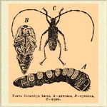Усач Cerambyx heros: A — личинка, B — куколка, C — жук.