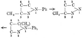 одновременно может происходить и ритмически правильное перемещение одного или нескольких атомов водорода, действительное положение которых не может быть, следовательно, передано обыкновенной структурной формулой; поэтому формулу метил-3(5)-пиразола Кнорр пишет таким образом: