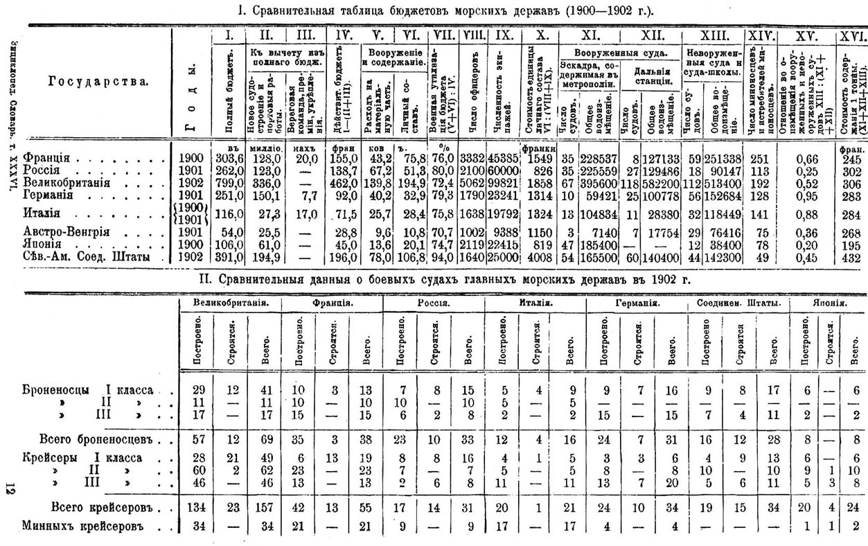 — Военный Ф. В приложенных двух таблицах указаны данные для сравнения военных Ф. главнейших морских держав. Первая таблица (из "Revue Maritime", 1902) дает сведения о том, во сколько обходятся единица личного состава и единица водоизмещения каждому государству. Общая стоимость содержания Ф. выведена в таблице посредством вычитания из общего бюджета расходов на постройку новых судов, портовые работы, пенсии и т. п. издержек, не относящихся собственно к судам Ф. Отношение этих издержек к общей сумме бюджета, представляющее, в сущности, боевую утилизацию бюджета Ф., является наименьшим во Франции (0,76) и наибольшим в Соединенных Штатах (0,94). В России оно — около 0,80. Расходы на 1 т водоизмещения исчислены только для больших судов; мелкие минные суда не вошли в общее водоизмещение. Наибольшая сумма содержания 1 т водоизмещения судов — в Сев.-Амер. Соединенных Штатах (432 фр.); наименьшая — в Японии (195 фр.); в России — около 302 фр. Из числа судов, взятых в расчет водоизмещения, суда небоевые составляют от 0,20 (Япония) до 3,06 (Австро-Венгрия) числа боевых судов. В России невооруженные суда составляют 25 % всего количества вооруженных судов Ф. Вторая таблица (из "Naval Annual of Т. A. Brassey", 1902) показывает количество готовых и строящихся судов различных государств к 1902 г.