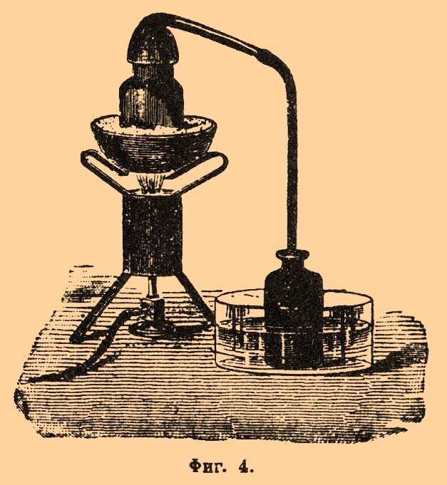 Соединения с водородом показывают ту же правильность, как и металлы: HF кипит при 19,5°, а HCl около —80°. В органических соединениях производные Ф. вообще имеют меньшую температуру кипения, чем хлористые производные, и часто более прочны, чем последние. Различие F от Cl, прежде всего, выражается в гораздо большей способности первого к реакциям, следовательно, и здесь видна последовательность с изменением атомного веса. Например, F+H выделяет 38,6 калорий, Cl+Н — 22,0 калории; Br+Н — 12,3 калории; I+Н — 0,3 калории (считая реагирующие тела и продукты реакции газообразными). Фтористое серебро AgF хорошо растворяется в воде, тогда как другие галоидные соединения серебра нерастворимы; фтористый кальций CaF 2, стронций SrF 2, барий ВаF 2, алюминий AlF 3 не растворимы в воде, тогда как соответствующие хлористые соединения растворимы. Ф. в некотором отношении сходен также с кислородом; он легко заменяет кислород в солях и разнообразных кислородных кислотах отчасти или сполна, образуя соответственные фторопроизводные. С водородом Ф., соединяясь непосредственно, даже в темноте, образует фтористо-водородную (плавиковую) кислоту HF или фтористый водород; она получается и разложением фтористых металлов кислотами (обыкновенно CaF 2 или криолита Al 2F6 6NaF). Для получения обыкновенной продажной фтористо-водородной кислоты разлагают плавиковый шпат серной кислотой (CaF 2 +Н 2 SО 4=2HF+CaSO4) и поглощают выделившийся HF водой; операцию производят в свинцовом тигле со шлемом и отводной трубкой, так как на свинец HF мало действует (образуется корка PbF 2, которая предохраняет металл); части прибора для герметичности соединяются между собой при помощи гипса (фиг. 4).