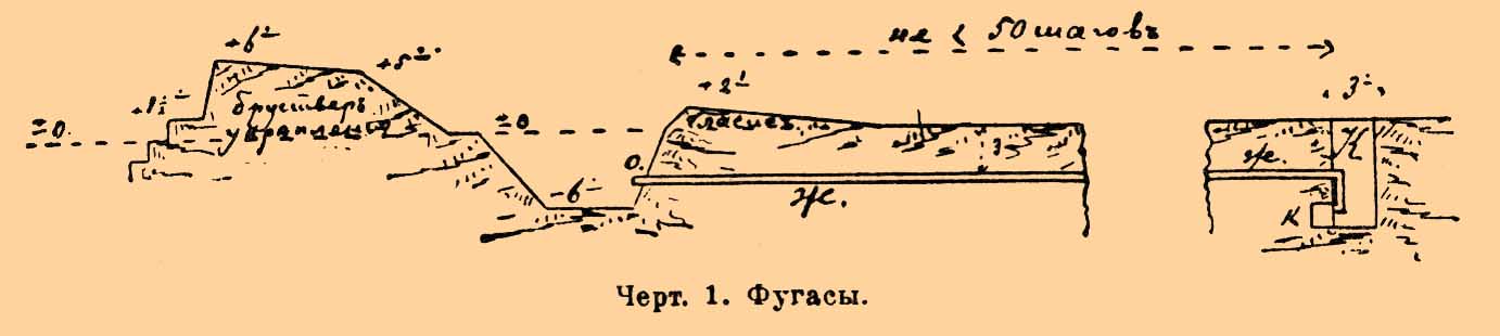 III) Бомбовые фугасы представляют зарытые в землю артиллерийские снаряды, поражающие при взрыве своими осколками; во избежание поражения своих людей их располагают не ближе 30—40 саженей от укрепления.