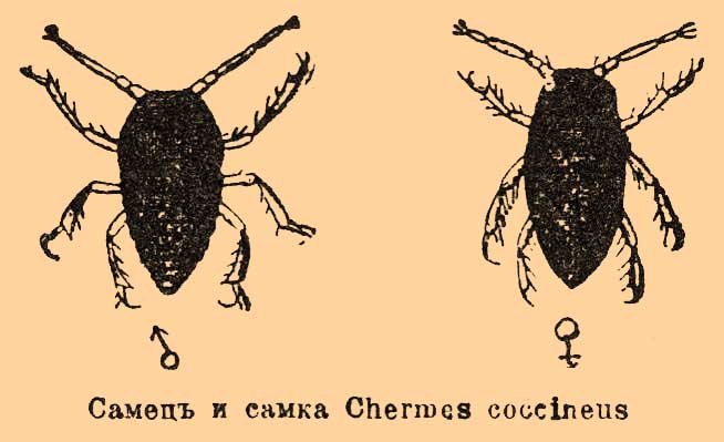 (Chermes) — род насекомых из отряда полужесткокрылых, или хоботных (принадлежащий к семейству тлей, или травяных вшей — Aphidae, см.). X. вместе с филлоксерой (Phylloxera) составляют подсемейство Phylloxeridae, о признаках которого см. Филлоксера. В роде Chermes, как у других тлей, различаются крылатые и бескрылые неделимые. Крылатые самки имеют 5-члениковые усики, фасетчатые глаза и короткие щетинки в хоботке. Крылья прозрачные, на передних передний край (costa) утолщенный; под ним проходит толстая продольная жилка (postcosta), a рядом с ней тонкая жилка, от которой отходят 3 косые жилки. Costa и postcosta сливаются вместе и образуют довольно большой глазок (Stigma); от косых жилок отходят — мелкие ветвящиеся. На задних крыльях одна продольная жилка, от которой отходит несколько вторичных слабых жилок. В покое крылья складываются крышеобразно. Бескрылые партеногенетические самки в молодом возрасте — удлиненно овальной формы с 3-члениковыми короткими усиками и короткими ногами; щетинки, хоботок бывают очень длинные; на спине у них находятся 6 продольных рядов хитиновых пластинок, причем строение их бывает характерным для отдельных видов X.; на каждой пластинке находится по 1 или по несколько фасеток или таких мест, через которые выделяется (пропотевает) восковой налет или пушок (выделение кожных желез).