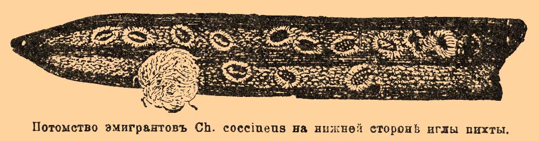 Потомство эмигрантов Ch. coccinеus на нижней стороне иглы пихты.