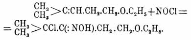 X. нитрозил есть желто-красный газ, легко сгущающийся в жидкость, закипающую при — 8°. С водой он дает соляную кислоту и раствор со свойствами азотистой кислоты. В последнее время X. нитрозил применяется в органической химии, как реактив. Так, Валлах, Тильден и Байер присоединяли его к различным терпеновым углеводородам и получали кристаллические продукты, которые позволяли, с одной стороны, различать друг от друга различные индивидуумы, а с другой, давали возможность для перехода от углеводородов к другим терпеннным производным. X. нитрозил соединяется с этиленовыми углеводородами и образует с некоторыми из них кристаллические хлорооксимы (Валлах, Ипатьев). Большей частью кристаллические соединения образуются в том случае, когда углеводороды имеют комплекс >С.СН. (Ипатьев). Точно так же X. нитрозил присоединяется к непредельным сложным и смешанным эфирам, причем, в случае нахождения в них упомянутого комплекса, образуются кристалл, хлоризонитрозосоединения, напр.: