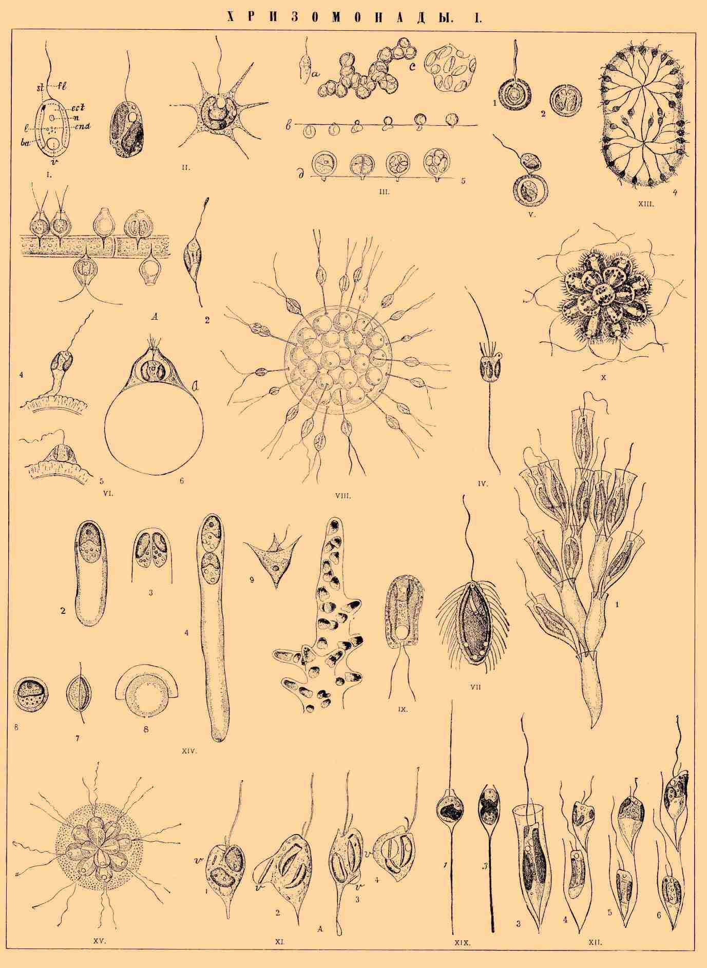 1. Тип строения хризомонады: ect — эктоплазма, chr — хроматофор, n — ядро, v — вакуоля, l — лейкозин, st — глазок, fl — жгутик. 2. Chrysamoeba radians Klebs: формы со жгутиком и с псевдоподиями (1000/1). 3. Chromulina Rosanoffii Bütschli: a — подвижная стадия, b — неподвижные стадии с ножкой на поверхости воды, c — скопление последних, d — развитие спорангия (620/1), e — Chr. nebulosa Cienk.: цисты (800/1). 4. Pedinella hexacostata Wyss. 5. Chrysococcus rufescens Klebs: подвижная стадия и деление (1200/1). 6. Chrysopyxis bipes Stein: клетки на нити водорослей Cladophora, 2, 4, 5 — образование кольца, 6 — форма с готовым кольцом, рассматриваемая en face (увел. прибл. 800). 7. Mallomonas acaroides Perty (1000/1). 8. Stylochrysalis parasitica Stein на круглой колонии Eudorina (650/1). 9. Hymenomonas roseola Stein (1000/1). 10. Synura Uvella Ehrb (650/1). 11. Ochromonas mutabilis Klebs: изменение формы и странствование питательной вакуоли (v.) (1000/1). 12. Dinobryon Sertularia Ehrb.: 1 колония (1000/1), единичный индивидуум (1300/1), 4—6 разделение и образование камеры (1000/1). 13. Uroglena Volvox Ehrb. Деление колонии (200/1). 14. Hydrurus foetidus Kirchn. 2—4 деление и начало образования колонии (1500/1), 5 верхняя часть колонии (540/1), 6 покоящаяся клетка, 7, 8 циста в профиль и en face, подвижная стадия (1500/1). 15. Syncrypta Volvox Ehrb. (650/1). 19. Stylococcus aureus Chodat (увел.). 20. Naegellia.