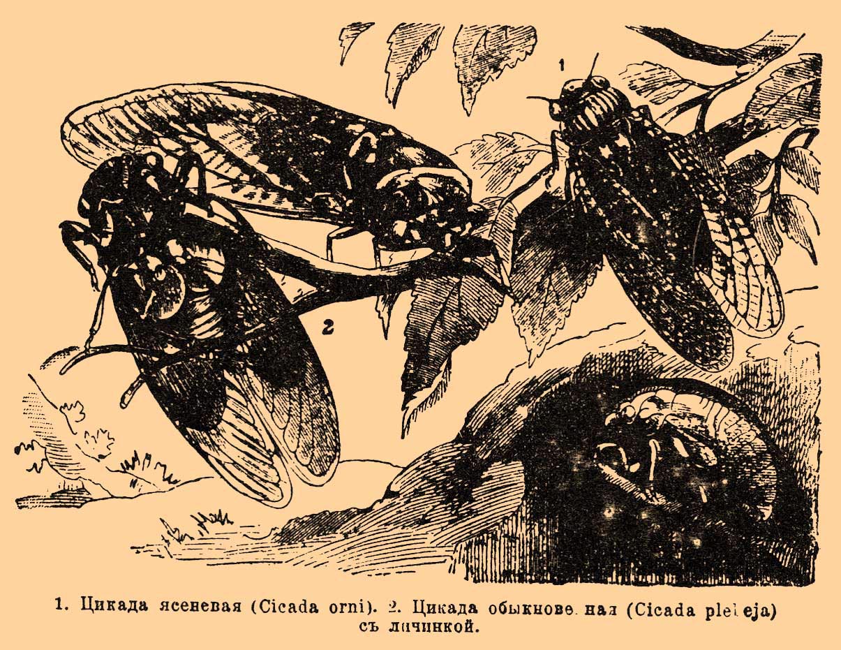 1. Цикада ясеневая (Cicada orni). 2. Цикада обыкновенная (Cicada plebeja) с личинкой.