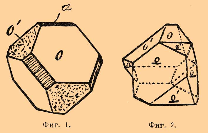 Грани куба (а) обыкновенно покрыты штрихами. Чрезвычайно часто наблюдаются двойники, у которых плоскостью срастания является грань тетраэдра, двойниковой же плоскостью плоскость (211). Вид двойников — фиг. 2.
