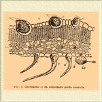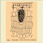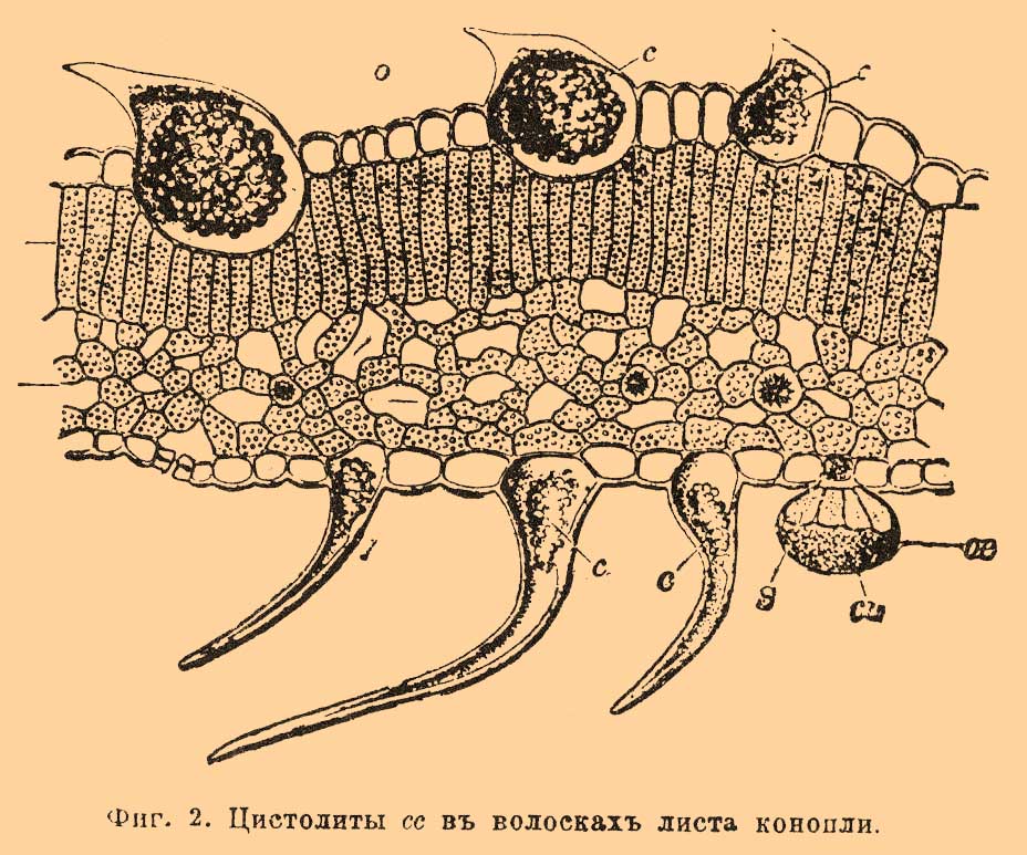 При обработке уксусной кислотой углекислая известь растворяется, основное же вещество остается и дает реакцию на клетчатку. В основном веществе после обработки кислотой можно заметить также концентрическую слоистость и радиальную полосатость. В листьях конопли (Cannabis sativa) Ц. отлагаются в волосках эпидермиса верхней и нижней поверхности листа (фиг. 2). Форма зависит от формы заключающих их клеток. Так, в коротких волосках конопли они округлой формы, в длинных волосках они вытянуты и изогнуты. Ц. имеют очень ограниченное распространение. Они встречаются почти исключительно у представителей семейств Urticaсеае и Acanthaceae.