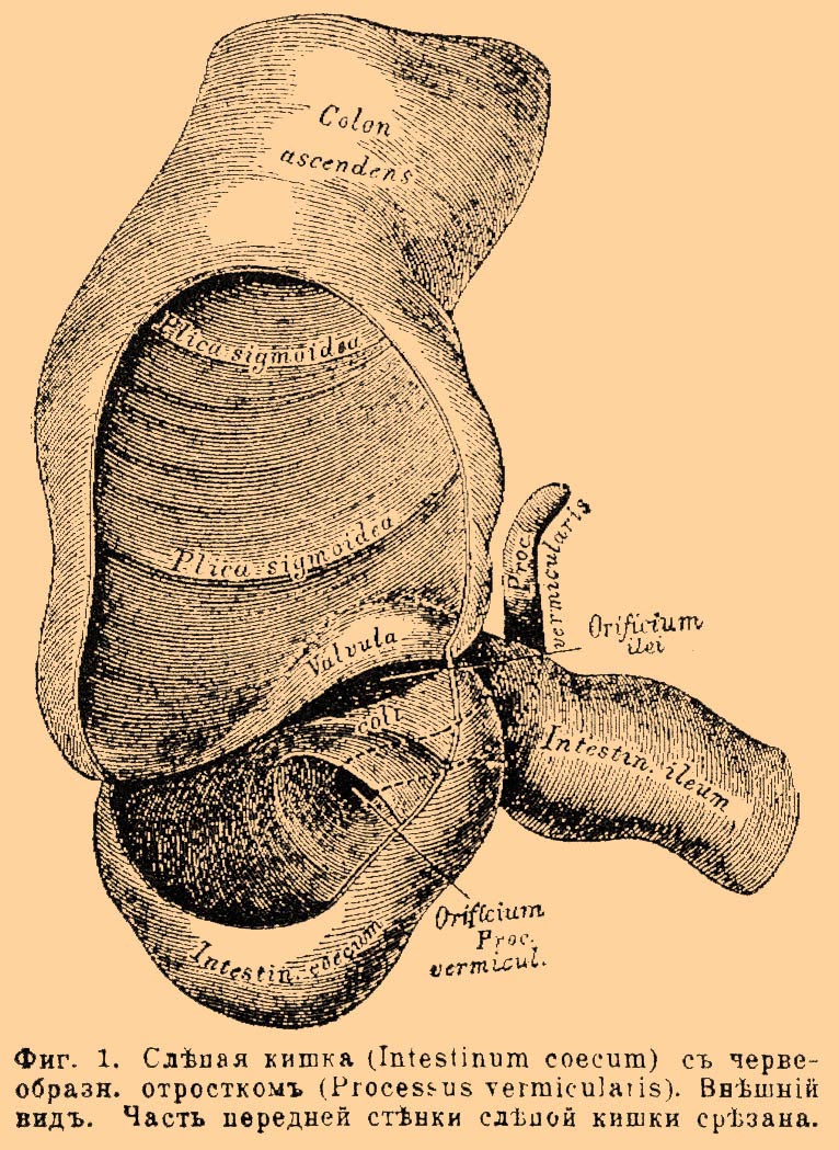Червеобразный отросток, воспаление его (appendicitis). — Ч. отросток представляет часть слепой кишки, отставшую в развитии и висящую на хорошо развитой остальной части в виде тонкого, полого, сообщающегося с кишкой и слепо оканчивающегося придатка, который напоминает по своему виду дождевого червя. Он встречается, помимо человека, у некоторых млекопитающих животных, например у многих грызунов, у некоторых видов обезьян. У человека представляет в настоящее время рудиментарный остаток, не имеющий ровно никакого функционального значения. Он отходит от слепой кишки, помещающейся в правой подвздошной области, в ее нижнем, обращенном к срединной линии отделе и направляется обыкновенно вверх и к срединной линии живота. В этом отношении встречаются, впрочем, многочисленные вариации; так, например, положение позади слепой кишки, направление вниз к малому тазу. Ч. отросток удерживается в своем положении узкой складкой брюшины, брыжейкой. Со слепой кишкой он сообщается посредством воронкообразного отверстия, которое окружено полулунной складкой (заслонка Герлаха). После рождения это отверстие начинает суживаться, так что уже на 2-м году жизни вход в Ч. отросток имеет меньший поперечник, чем просвет самого отростка. Самый отросток продолжает расти в длину и в ширину до 20-летнего возраста, когда он достигает длины в 9 см и толщины в 7 мм (с гусиное перо). Затем он претерпевает обратное развитие, так что к 50 годам поперечник его становится меньше, нежели у новорожденного. На старости происходит полное заращение (облитерация) просвета отростка. Стенка Ч. отростка представляет в общем тот же состав, что и стенка кишки, а именно считая изнутри имеются следующие слои: слизистая оболочка, подслизистый слой, сравнительно толстый слой соединительной ткани с заложенными в нем артериями и лимфатическими сосудами, мышечный слой, брюшинный покров.
