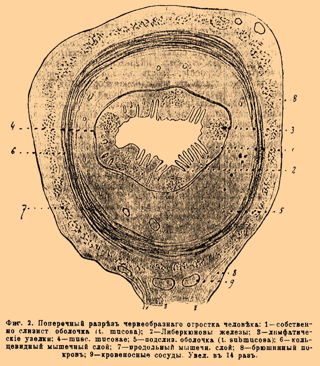 Фиг.2. Поперечный разрез червеобразного отростка человека: 1 — собственно слизистая оболочка (t. mucosa); 2 — Либеркюновы железы; 3 — лимфатические узелки; 5 — подслизистая оболочка (t. submucosa); 6 — кольцевидный мышечный слой; 7 — продольный мышечный слой; 8 — брюшинный покров; 9 — кровеносные сосуды. Увеличено в 14 раз.