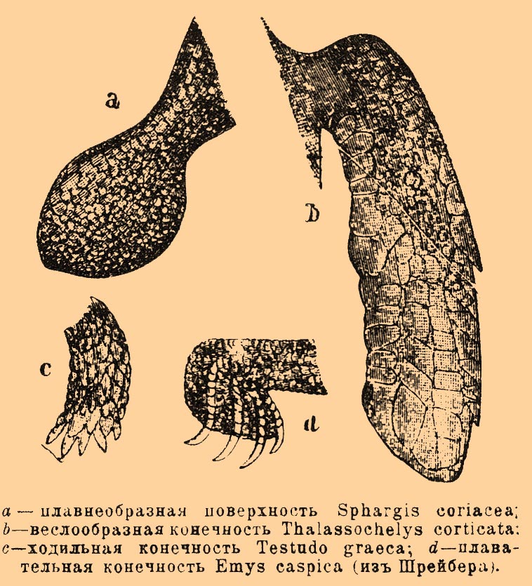 a — плавнеобразная поверхность Sphargis coriacea; b — веслообразная конечность Thalassochelys corticata; c — ходильная конечность Testudo graeca; d — плавательная конечность Emys caspica (из Шрейбера).