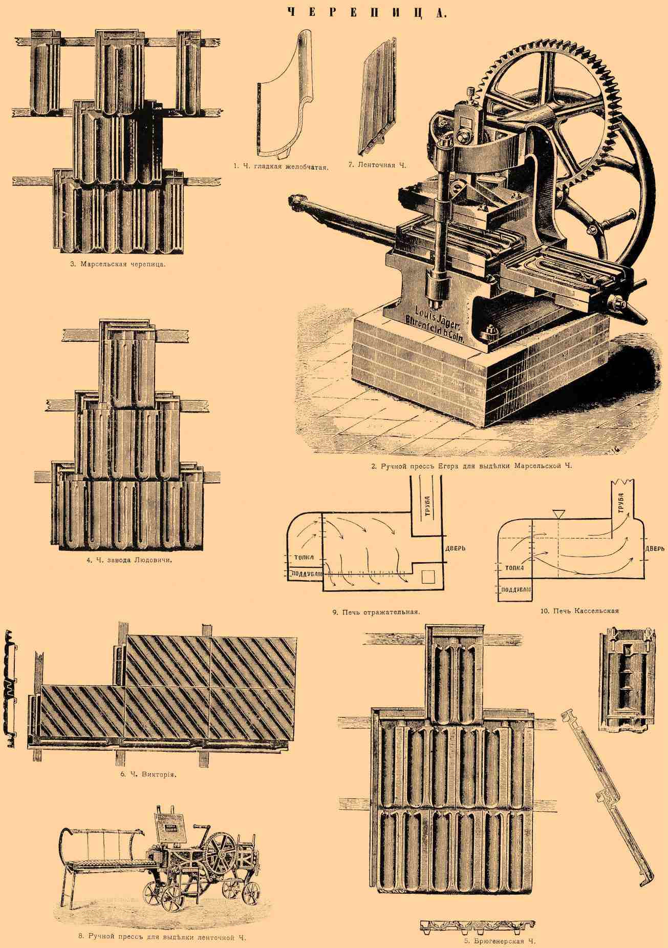 Фиг. 1. Черепица гладкая желобчатая. Фиг. 2. Ручной пресс Егера для выделки марсельской черепицы. Фиг. 3. Марсельская черепица. Фиг. 4. Черепица завода Людовичи. Фиг. 5. Брюгенерская черепица. Фиг. 6. Черепица Виктория. Фиг. 7. Ленточная черепица. Фиг. 8. Ручной пресс для выделки ленточной черепицы. Фиг. 9. Печь отражательная. Фиг. 10. Печь кассельская.