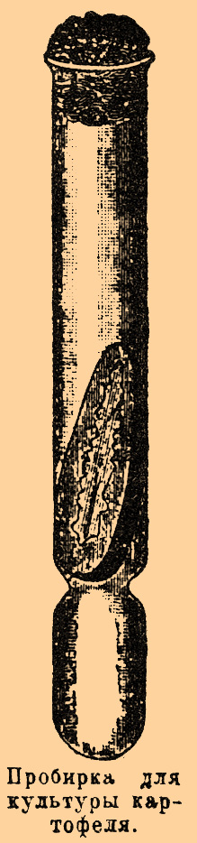 Культивируя бактерии и дрожжи на желатине, замечено было, что при культуре известных микроорганизмов желатин разжижается (вследствие выделения особого энзима (см.), а при культуре других остается в твердом виде. Это обстоятельство позволило, в целях диагностики, разделить бактерий на две группы: разжижающие и не разжижающие желатин, группы, конечно, не филогенетические и часто, кроме этого общего признака, ничем больше не сходные между собой. Мало того, даже и этот признак у некоторых видов, со слабо выраженной способностью разжижать желатин, вполне зависит от способа приготовления желатина — от продолжительности и степени нагревания его при фильтрации и стерилизации и, ясно, что вполне зависит от концентрации и реакции среды, температуры и т. д. В микробиологии прибегают к желатинированию сред самого разнообразного состава: бульон, различные растительные отвары, пивное и виноградное сусло и т. п. Другая твердая среда, тоже получившая широкое применение в бактериологии, это агар-агар, впервые примененный г-жой Hesse(по Hueppe) и представляющий различные виды красных водорослей из родов Gigartina, Gracillaria и Gelidium. Агар-агар, прибавленный к жидкой среде, делает ее твердой подобно желатину, но отличается от нее более высокой точкой плавления (выше 40° Ц.) и неспособностью разжижаться от выделяемых бактериями энзим (в последнее время были найдены, однако, некоторые бактерии, способные его разжижать). Приготовление как желатины, так еще больше агар-агара связано с целым рядом технических затруднений, зависящих от крайне медленной фильтрации этих сред, почему в бактериологической технике и отводится довольно много места описанию различных приемов при приготовлении этих твердых сред. Кроме названных сред, применяются еще для культивирования бактерий: картофель, морковь и др. овощи. Для приготовления сред из картофеля пользуются особыми пробирками или же теми же чашечками Петри, которые применяются при разливках.