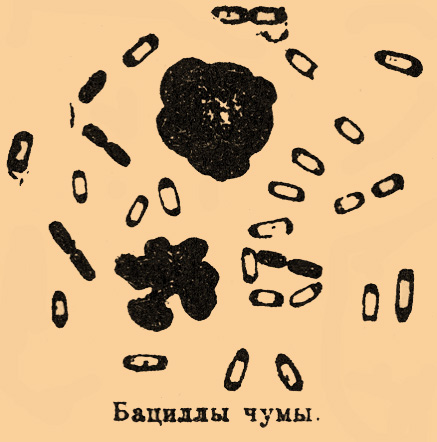 Бактериология Ч. Чума вызывается особой бактерией, которая была открыта в Гонг-Конге в 1893-94 гг. одновременно двумя бактериологами, французским — Йерсеном, и японским — Китасато, совершенно независимо друг от друга. Специфичность этой палочки для Ч. не подлежит сомнению, ибо 1) со времени ее открытия она была неизменно находима при всех вспышках Ч., имевших место в последние годы во всех концах земного шара; 2) ее находят только у чумных больных и никогда у здоровых людей или у больных, страдающих какими-либо другими болезнями; 3) чистые культуры этой палочки, будучи привиты животным, восприимчивым к Ч., вызывают у них болезнь, совершенно тожественную с самопроизвольной Ч.; 4) наблюдались случаи нечаянного самозаражения людей от животных, зараженных чистыми культурами чумной палочки, причем у заразившихся людей развивалась совершенно типическая Ч.; наконец, 5) в крови животных, зараженных живыми или убитыми культурами чумной палочки, появляются специфические вещества, предохраняющие людей и животным от самопроизвольной и прививной Ч. Чумные бактерии представляются при увеличении в тысячу раз в виде весьма коротеньких, слегка овальных палочек, иногда настолько коротких, что их можно принять за шарик. Они легко окрашиваются всеми щелочными анилиновыми красками, обычно употребляемыми для окраски бактерий, как, например, фуксином, метиленовой синькой, генциан-виолетом и др. Особенно типично для чумных палочек то, что они часто, хотя и далеко не всегда, окрашиваются преимущественно по концам (полюсам), тогда как середина остается бесцветной (биполярная окраска, см. рис.).