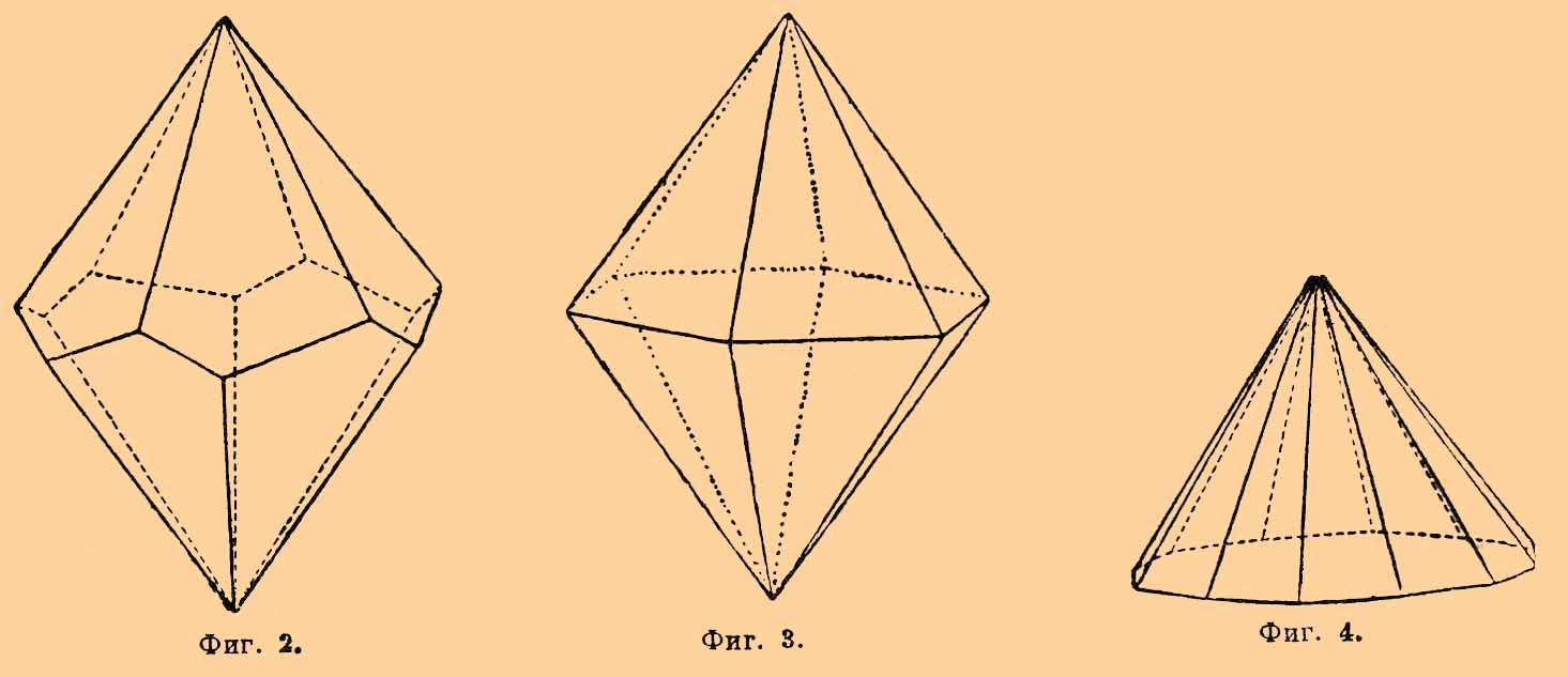 Теперь просмотрим все пять классов системы: 1) гексагонально-пирамидальный, обладает только шестерной осью симметрии. Типичная форма — гексагональная пирамида (см. фиг. 1).Из минералов примером может служить нефелин.