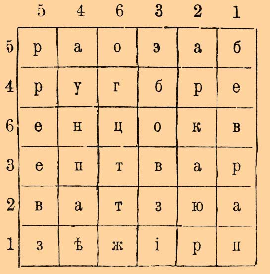 Особую категорию образуют так называемые шифры с перемещением. Буквы, входящие в состав письма, остаются те же, но пишутся в ином порядке. Их сначала помещают в клетки квадрата, причем располагают либо от правой руки к левой, либо сверху вниз или снизу вверх попеременно, либо, наконец, по диагонали; шифрованное таким образом письмо пишется уже, как всегда, от левой руки к правой. В этой категории шифров самым интересным является так называемый "шифр нигилистов". "Нигилисты" для нумерации клеток квадрата (по Флейснеру) пользовались определенным словом-секретом; буквы секрета нумеровались сообразно с местом, занимаемым ими в порядке алфавита. Номера эти наносились как на линию языка, так и на секретную линию; числа секретной линии в таком случае обозначали порядок строк, а числа линии языка — порядок букв в каждой строке. Пусть, например, секретом служило слово "Москва", и требовалось шифровать телеграмму: "Прiезжаю завтра в Петербургъ. Базаровъ". По "Ш. нигилистов" текст, разделенный на 5 групп, представляется в следующем виде: раоза бругбреенцоквеп тварв атзюа зежiрп.