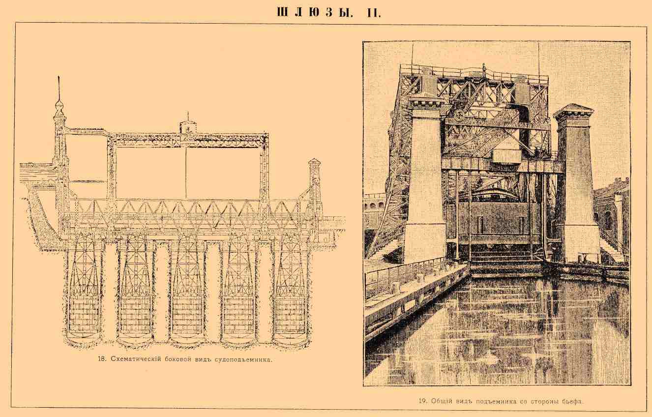 ШЛЮЗЫ II. 18. Схематический боковой вид судоподъемника. 19. Общий вид судоподъемника со стороны бьефа.