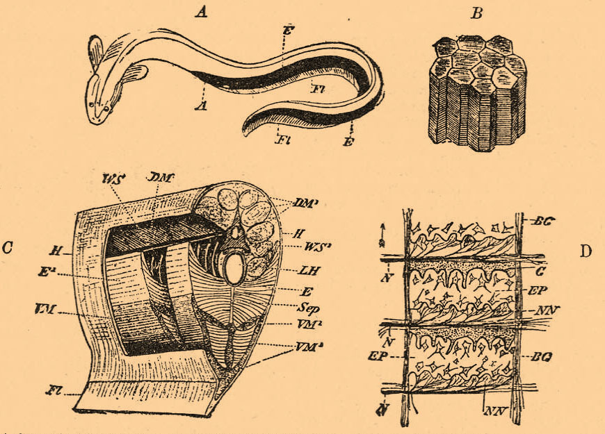 Фиг. 2. A. Gymnotus electricus. E — электрический орган; Fl — плавник; А — заднепроходное отверстие. В. Электрические столбики мраморного ската. С. Препарат электрического угря. FI — плавник; DM, DM' и VM, VM ' — спинные и брюшные пучки боковых туловищных мускулов; E — электрический орган в разрезе, E' — сбоку; WS, WS' — позвоночник; LS — полость тела; Sep — фиброзная перепонка, делящая электрический орган на правую и левую половину. D. Гистологическое строение электрического органа ската. Схема. ВG — соединительнотканный остов, EP — электрические пластинки; N — подходящий нерв; NN — eгo последние разветвления; G — студенистая ткань с рассеянными в ней клетками. Все четыре фигуры — из Видерсгейма.