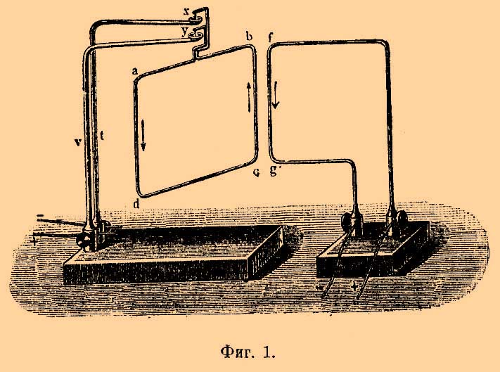 1) Два параллельных проводника, по которым проходит ток, притягиваются, если в них токи одинаково направлены, и отталкиваются, если токи направлены в противоположные стороны. Фиг. 1 изображает прибор, служащий для обнаружения этого свойства.