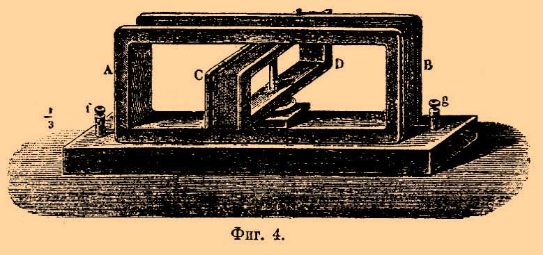 Подвижной контур abcd, по которому течет электрический ток, совершенно определенно устанавливается относительно неподвижной проволоки fg, по которой также идет ток, именно к проволоке fg притягивается сторона bc или ad в зависимости от того, как течет ток в fg. В случае изображенном на рисунке, сторона bс должна оттолкнуться, а сторона ad притянуться к fg. Однако контур аbсd и без присутствия контура ef устанавливается определенным образом, а именно, в плоскости, перпендикулярной к магнитному меридиану (см. Электромагнетизм). Чтобы ослабить действие магнитного поля на подвижный контур, Ампер изобрел "астатический" контур, устроенный, как показано на фиг. 2.