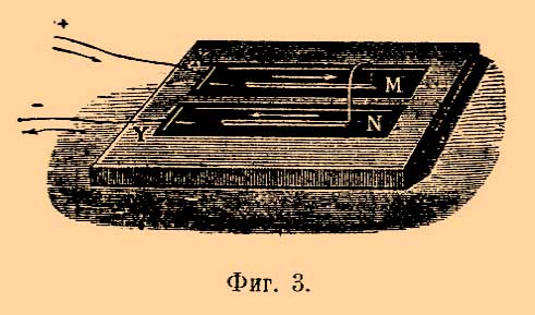 В доске сделано два параллельных желоба М и N, заполненных ртутью. В ртуть опущены проводники X и Y от батареи. Соединение между двумя желобами устанавливается при посредстве подвижной скобки, горизонтальные части которой, кроме кончиков, тщательно изолированы. При замыкании тока скобка отплывает от Х и У.