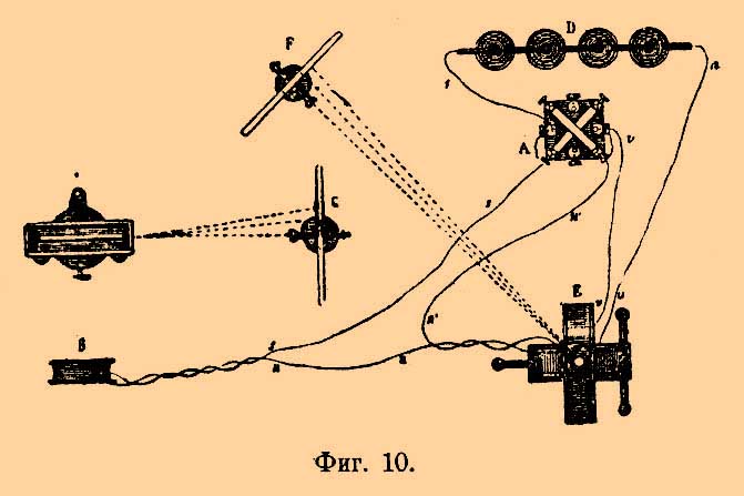 Фиг. 9 показывает устройство электродинамометра, которым воспользовался Вебер для этой цели, а фиг. 10 — общую схему приборов. Неподвижная катушка укреплена в скамеечке, опирающейся на три ножки. Она может быть расположена как угодно относительно подвижной катушки. Для того, чтобы удобно определять положение неподвижной катушки относительно подвижной, стол покрывался бумагой. Три ножки скамеечки продавливали в бумажке ямочки a , b, g ; таким образом можно было после опыта удобно измерить расстояние катушек. На рисунке пунктиром указаны места, в которых помещалась неподвижная катушка. Расстояние между центрами катушек доходило до весьма значительных величин. Фиг. 10 показывает общее расположение приборов. Ток от батареи идет через коммутатор А, особую катушку В, электродинамометр и возвращается назад в батарею. Катушка B, расположенная плоскостями витков в магнитном меридиане на некотором расстоянии от магнитометра С, служила для определения силы тока в цепи. Ток в катушке В вызывал отклонение магнита в магнитометре, а тангенс угла отклонения пропорционален силе тока в катушке. Неподвижная катушка располагалась плоскостями оборотов в магнитном меридиане; подвижная —перпендикулярно ей. Коммутатор менял направление тока в неподвижной катушке и в катушке В. Подвижная катушка была непосредственно до коммутатора соединена с батареей и в ней направление тока не менялось. Отклонения в магнитометре и электродинамометре определялись по методу трубы и шкалы. Вебер пользовался формулами Ампера для системы круговых оборотов и выводил формулы для моментов вращения подвижной катушки при осуществленных им взаимных положениях катушки. Подставляя в эти выражения силу тока, зная момент вращения, испытываемый подвижной катушкой от закручивания проволок, он мог вычислить угол поворота в делениях шкалы и сравнить с действительно наблюденным. И в этом случае согласие получилось очень хорошее. Сообщаю несколько данных (см. Боргман, "Учение об электрических и магнитных явлениях", 2-й т., стр. 349):