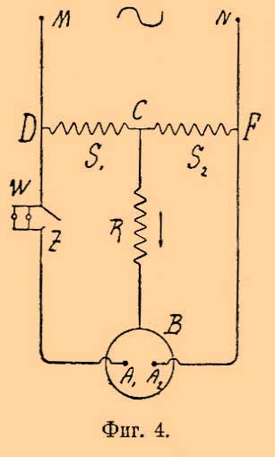 Выпрямитель Миткевича (фиг. 2) работает с раствором двууглекислой соды крепостью 7 %— 8 % и работает вполне удовлетворительно и постоянно, не требуя никакого досмотра, вплоть до израсходования всей проволоки. Необходимо только озаботиться, чтобы алюминиевый электрод, погружаемый в первый раз в жидкость, имел бы чистую металлическую поверхность. Раствор соды действует без замены и только необходимо удалять по накоплении осадок гидрата окиси алюминия. Следует заметить, что свойствам алюминия обладает целый ряд металлов (магний, висмут, сурьма и кадмий). При работе с одним алюминиевым выпрямителем можно получить в форме постоянного тока более 40% энергии переменного тока. Применением нескольких выпрямителей и их комбинацией, дающей возможность утилизировать и отрицательную часть переменного тока, можно повысить отдачу до 80 % (Поллак), хотя измерения других дают 60 % — 65 %. Выпрямленный ток не похож на обычный постоянный ток. Существует, однако, целый ряд схем, дающих возможность приблизить выпрямленный ток к обычному постоянному (схема Греца, фиг. 3, В. Миткевича фиг. 4).