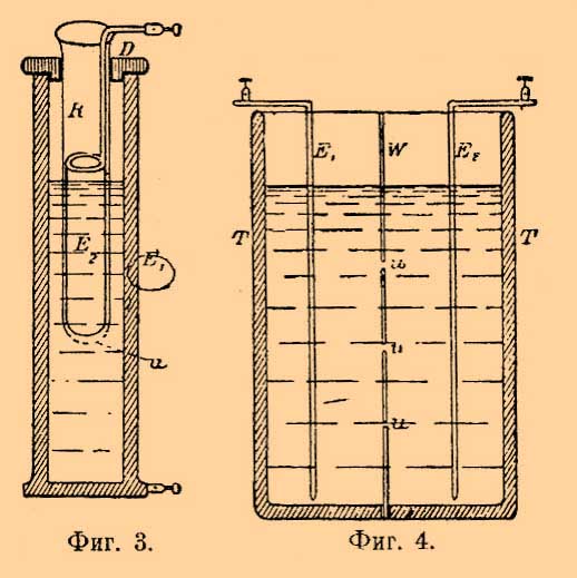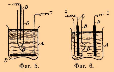 Первый прерыватель Симона (фиг. 3) представляет свинцовый сосуд E1 30 см длиной и 7 см в диаметре, в который через эбонитовую крышку D вставляется стеклянная пробирка R со свинцовым внутри её цилиндром Е 2. В дне пробирки R проделаны одно или несколько (до 8) маленьких отверстий диаметром 0,5 — 1 мм. Прибор наполнен слабым раствором серной кислоты. Сосуд E1 и цилиндр Е 2 включаются в цепь источника тока. Действует он так же хорошо, как и прерыватель Венельта (при работе катушки с искрой в 30 см с этим прерывателем, имеющим в пробирке три отверстия в 1 мм, число прерываний при напряжении источника тока 130 вольт было 500 — 700 в секунду, при напряжении 70 вольт — 200 — 300 в секунду). На фиг. 4 представлена вторая форма того же прерывателя. В стеклянный сосуд 25 см высотой, 7 х 10 см основанием, вставлены свинцовые электроды а и b, разделенные стеклянной перегородкой с маленькими отверстиями. Отличительной особенностью прерывателя Симона является безразличное относительно направления тока включение его в цепь. Подобные прерыватели (фиг. 5 и 6) независимо от Симона устроили несколько позже Венельт и Caldwell.