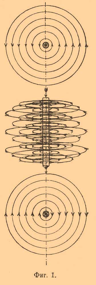 — Электромагнитом называется всякое железное, стальное или чугунное тело (сердечник Э.), могущее быть временно намагниченным посредством пропускания электрического тока по проводнику (обмотка Э.), окружающему это тело. Вокруг всякого проводника, по которому проходит электрический ток, возникает магнитное поле (см.), характер которого может быть описан указанием расположения и распределения магнитных силовых линий этого поля. Если проводник представляет тонкую проволоку значительной длины, то магнитные силовые линии созданного вокруг проволоки поля представляют вокруг каждой точки проволоки систему концентрических кругов, расположенных вокруг проволоки, как вокруг оси (фиг 1.)