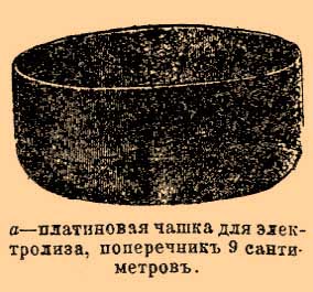 — Под Э. анализом должно подразумевать: применение явлений, наблюдаемых при прохождении тока через раствор электролита, к качественному открытию какого-либо вещества или к определению его количества в растворе, другими словами, в этом случае задачи аналитической химии решаются Э. методом. Все изучаемые в электрохимии явления, как то: выделение электролизом веществ, электропроводность растворов, электровозбудительные силы на границе раствора и металла и др., могут служить целям аналитической химии. Из них только выделение электролизом веществ из растворов получило общее распространение как метод анализа. В настоящее время сравнительно редко применяются наблюдения электропроводности для целей анализа и еще реже измерение электровозбудительных сил. Однако можно с уверенностью сказать, что методы электропроводности и электровозбудительных сил в применении к анализу приобретут в недалеком будущем обширное значение. Зачатки анализа первым из упомянутых методов, т. е. электролизом, должно отнести к годам открытия гальванизма. Cruikschank уже в 1801 г., говоря о том, что током выделяются металлы из водных растворов, пишет: "из этих опытов ясно следует, что гальванизм может быть с успехом применен к анализу минералов, в особенности для выделения из растворов свинца, серебра и меди, а также для открытия небольших количеств металлов, о чем я сужу по непосредственным опытам". Вслед за тем, вплотную до начала шестидесятых годов прошлого столетия, встречается целый ряд указаний на возможность применения гальванического тока для качественного открытия металлов в растворах. Все эти указания потеряли в настоящее время практическое значение. Современная химия дает так много различных и притом простых качественных методов, что вряд ли кому придет в голову прибегать с этой целью к электролизу. Совершенно иное должно сказать о количественном определении веществ. Первые применения электролиза к количественным определениям металлов принадлежат Волькоту Гиббсу. Он в 1864 г. предложил никелевую монету анализировать, растворяя ее в кислотах и определяя никель и медь электролизом. В 1865 г. Лучков все медные соединения анализирует электролизом. Впоследствии целый ряд авторов принимали участие в разработке как методов отделения одного метала от другого электролизом, так и методов полного их осаждения на электродах. Среди этих исследований различных ученых в особенности выделяются работы Классена и Смисса (Smith). Современные приемы электроанализа очень просты.