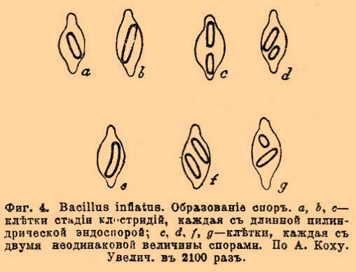 Фиг. 4. Bacillus inflatus a, b, c — клетки стадии клостридий, каждая с длинной цилиндрической эндоспорой ; e, d, f, g — клетки, каждая с неодинаковой величины спорами. По А. Коху. Увелич. в 2100 раз.