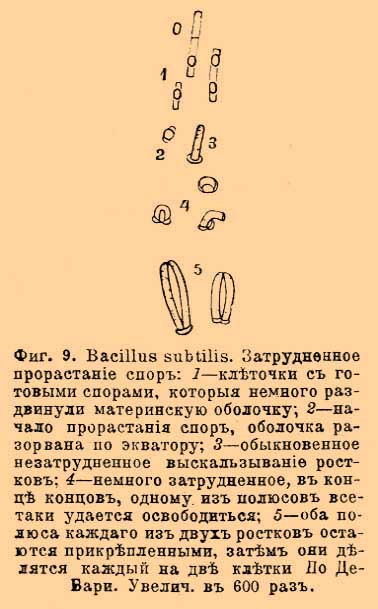 Второй способ (напр., у Clostridium butyricum, фиг. 3 и 7) заключается в том, что оболочка споры лопается на одном из полюсов её и из отверстия выходит новая клетка. Третий способ наблюдался, напр., у Bacillus subtilis, Bacillus Megaterium и отличается от второго тем, что оболочка лопается не на полюсе а на экваторе (фиг. 1, 8 и 9).