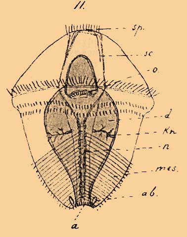 Эмбриональное развитие. Оплодотворенные яйца претерпевают полное равномерное или неравномерное дробление, результатом которого является бластула, из которой образуется гаструла эмболическим (Bonellia), или эпиболическим (Thalassema) путем (табл., фиг. 9), или же способом, представляющим нечто среднее между этими двумя способами гаструляции (эмболия, но без внутренней полости). Эти различные способы образования гаструлы находятся в зависимости от количества питательного желтка в дробящемся яйце. Гаструла превращается в свободно плавающую личинку (табл., фиг. 10—11), очень похожую на трохофору (см.) прочих кольчатых червей: ресничный покров, покрывавший равномерно все тело личинки, сосредоточивается в виде пучка или султана ресничек на переднем конце тела и экваториального венчика ресничек, помещающегося над бластопором. Кишечник (средняя кишка) образуется из энтодермального гастроцелия, а впячиванием эктодермы на месте бластопора образуется передняя кишка с ротовым отверстием (табл., фиг. 9—10 о), лежащим сбоку тела. В шаровидной личинке различают теперь два отдела: преоральный, лежащий впереди экваториального венчика ресничек, и посторальный. На апикальном (т. е. противоположном султану ресничек конце) полюсе впячиванием эктодермы образуется анальное отверстие (табл., фиг. 10 a) и задняя кишка, которая срастается со средней кишкой, делающей при дальнейшем росте петлеобразные завороты. Экваториальный венчик ресничек дифференцируется на два венчика, из коих один — преоральный, располагается впереди ротового отверстия, а другой, посторальный, — позади (табл., фиг. 10) последнего. Мезодермальные клетки обособляются в стадии гаструлы у бластопора и, отделившись от экто-энтодермы, заползают в бластоцель; в описываемую стадию мезодерма представляется в посторальном отделе личинки в виде двух рядов клеток (табл., фиг. 10—11 mes), расположенных на брюшной стороне по обе стороны кишечника (мезодермические полоски), а в преоральном отделе — в виде отдельных мезенхиматических мышечных клеток (табл., фиг. 10), дающих впоследствии мускулатуру хоботка. Из передних клеток мезодермических полосок развиваются протонефридии или головные почки (табл., фиг. 11 kn), тогда как прочие идут на образование первичных сегментов, возникающих таким же путем, как у всех прочих кольчатых червей. В связи с внутренними мезодермическими перегородками образуются и наружные кольца (табл., фиг. 11), отделенные друг от друга венчиками ресничек. Такая сегментация является, однако, преходящей: вскоре венчики ресничек, равно как и перегородки между отдельными полостями сегментов, редуцируются, и из 15 заложенных первичных сегментов остается только кожно-мускульный и кишечно-мускульный листки мезодермы. Головные почки исчезают и вместо них возникают из мезодермы сегментальные органы. Анальные мешки (табл., фиг. 11—12 a. b.) образуются в кожно-мускульном листке мезодермы на заднем конце личинки и впоследствии сообщаются с задней кишкой, тогда как на их наружной поверхности появляются мерцательные воронки. Нервная система (табл., фиг. 11 n) закладывается в личиночном состоянии на брюшной стороне по обе стороны тянущегося от ротового отверстия вплоть до порошицы мерцательного желобка; она дифференцируется из эктодермы в виде утолщений (табл., фиг. 12 n), на которых на равных друг от друга расс