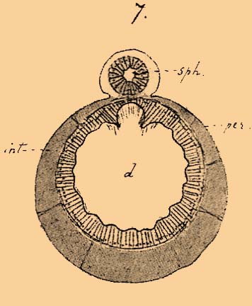 Таблица ЭХИУРОВЫЕ. Фиг. 7. Echiurus. Поперечный разрез через кишечник в области охватывающего его спинного сосуда (сердца).