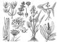 Водные растения: 1 — наяда морская; 2 — роголистник (а — пестичный цветок, б — тычиночный цветок); 3 — частуха; 4 — стрелолист; 5 — водяной орех (а — плод); 6 — сусак (а — часть растения с корневищем, б — соцветие); 7 — рдест блестящий.