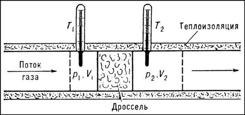Д. — Т. э. был обнаружен и исследован английским учёными Дж. Джоулем и У. Томсоном в 1852—62. В опытах Джоуля и Томсона измерялась температура в двух последовательных сечениях непрерывного и стационарного потока газа (до дросселя и за ним, рис. 1). Значительное трение газа в дросселе (мелкопористой пробке из ваты) делало скорость газового потока ничтожно малой, так что при дросселировании кинетическая энергия потока была очень мала и практически не менялась. Благодаря низкой теплопроводности стенок трубы и дросселя теплообмен между газом и внешней средой отсутствовал. При перепаде давления на дросселе Dp = p1 — р2, равном 1 атмосфере (1,01×105 н/м2), измеренная разность температур DT = T2 — T1 для воздуха составила — 0,25°С (опыт проводился при комнатной температуре). Для углекислого газа и водорода в тех же условиях DТ оказалась, соответственно, равной -1,25 и +0,02°С.
