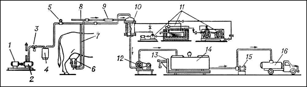 Схема доильной установки с молокопроводом: 1 — электродвигатель; 2 — вакуум-насос; 3 — вакуум-регулятор; 4 — вакуум-баллон; 5 — вакуумметр; 6 — доильный аппарат; 7 — вакуум-трубопровод; 8 — молокопровод; 9 — фильтр; 10 — охладитель; 11 — холодильная установка с насосом; 12 и 13 — молочные насосы; 14 — ёмкость для временного хранения молока; 15 — весы: 16 — молоковоз. Стрелками показано движение молока.