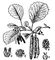 Рис. 1. Ольха чёрная, ветка с тычиночными (♂) и пестичными (♀) соцветиями; а — пестичный дихазий; б — тычиночный дихазий; в — соплодие; г — плод.