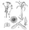 Плоды (1,4,5) и семена (2, 3, 6) с приспособлениями для переноса их ветром: 1 — одуванчика; 2 — хлопчатника; 3 — кипрея; 4 — берёзы; 5 — клёна; 6 -сосны.