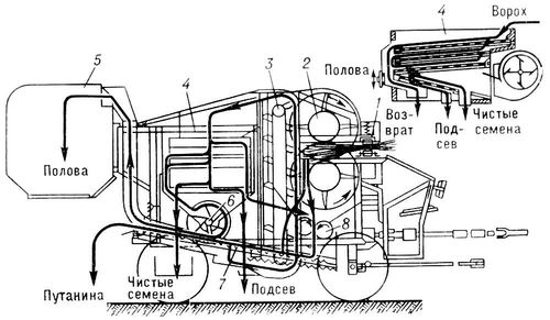 Схема льномолотилки: 1 — зажимной транспортёр; 2 — очёсывающий аппарат; 3 — ковшовый элеватор; 4 — веялка; 5 — бункер для сбора половы; 6 — вентилятор веялки; 7 — грохот; 8 — тёрочный аппарат.