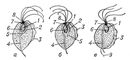 Трихомонады: а — T. vaginalis; б — T. tenax; в — T. hominis. 1 — ядрышко; 2 — парабазальный аппарат; 3 — ундулирующая мембрана; 4 — аксостиль; 5 — парабазальная нить; 6 — ядро; 7 — блефаропласт; 8 — передние жгутики; 9 — конечный жгутик.