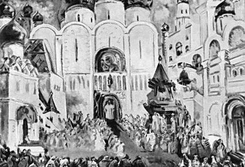 Ф. Ф. Федоровский. Эскиз декорации к опере М. П. Мусоргского «Борис Годунов». 1946. Музей Большого театра. Москва.