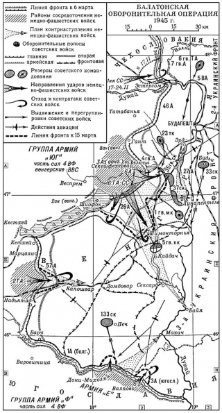 Балатонская оборонительная операция 1945, операция войск 3-го Украинского фронта (командующий Маршал Советского Союза Ф. И. Толбухин) 6—15 марта в районе оз. Балатон (Венгрия) во время Великой Отечественной войны 1941—45. Завершив Будапештскую операцию 1944—45, войска 3-го Украинского фронта приступили к подготовке наступления на Вену. В составе фронта насчитывалось 37 стрелк., 3 кавалерийские и 6 болгарских пехотных дивизий, 2 танковый и 1 механизированный корпус (свыше 400 тыс. чел., ок. 7 тыс. орудий и миномётов, 400 танков и самоходных установок, ок. 1000 самолётов). В середине февраля советскому командованию стало известно о сосредоточении в районе оз. Балатон крупных сил противника в целях готовящегося им контрнаступления. Было решено временно перейти силами 3-го Украинского фронта к обороне, измотать и обескровить противника, после чего перейти в наступление на венском направлении. Немецко-фашистское командование надеялось разгромить войска 3-го Украинского фронта, восстановить фронт обороны по р. Дунай и стабилизировать положение на всём южном участке советско-германского фронта с целью ликвидировать угрозу южным районам Германии и группировкам своих войск в Югославии, Австрии и Чехословакии. Вместе с переброшенной с Западного фронта 6-й танковой армией СС в районе оз. Балатон противник сосредоточил 31 дивизию (в т. ч. 11 танк.), 5 боевых групп и 1 моторизованную бригаду (св. 430 тыс. чел., св. 5600 орудий и миномётов, ок. 900 танков и штурмовых орудий и 850 самолётов). Наступление немецко-фашистских войск началось утром 6 марта. Главный удар наносился между озёрами Веленце и Балатон. Сосредоточивая на отдельных участках по 50—60 танков на 1 км фронта, противник пытался расчленить советские войска и выйти к Дунаю. Помимо главного удара, противник наносил 2 вспомогательных удара: из района южнее оз. Балатон на Капошвар и с южного берега р. Дравы на Печ. Стойкость советских частей и соединений, широкий маневр на поле боя артиллерийскими средствами и высокое воинское мастерство советских солдат и офицеров свели на нет все усилия врага. Потеряв свыше 40 тыс. чел., ок. 500 танков и штурмовых орудий, 300 орудий и миномётов, немецко-фашистские войска были вынуждены 15 марта прекратить наступление.