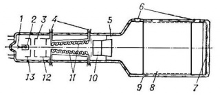 По характеру регистрируемых сигналов и особенностям их воспроизведения основные типы О. э. т. подразделяют на низкочастотные, широкополосные (высоко — и сверхвысокочастотные), высоковольтные, запоминающие, многолучевые, с радиальным отклонением луча. Низкочастотные О. э. т. рассчитаны на полосу частот исследуемых переменных во времени процессов в диапазоне от нуля до десятков Мгц. Они имеют, как правило, электростатическую систему фокусировки и отклонения, достаточную чувствительность (отклонение луча до 5 мм /в), зелёный цвет свечения экрана. Широкополосные О. э. т. (рис.) позволяют исследовать сигналы в полосе частот от нуля до нескольких Ггц. Они превосходят другие типы О. э. т. по чувствительности (до 10 мм /в), скорости записи (до десятков тыс. км/сек) и разрешающей способности (ширина линии от 50 до 300 мкм). Расширение полосы частот достигается использованием вместо сигнальных пластин отклоняющей замедляющей системы с «бегущей волной», обычно в форме спирали, а высокая скорость записи — ускорением электронов после их отклонения (послеускорением) посредством высокого напряжения (8—25 кв). Высоковольтные О. э. т., применяемые для регистрации импульсов высокого напряжения, имеют очень малую чувствительность (от 0,05 до 20 мм /кв) и высокую электрическую прочность (до нескольких десятков кв). Запоминающие О. э. т. (потенциалоскопы) с видимым изображением, служащие для запоминания информации в виде электрических сигналов и воспроизведения их на экране, имеют наибольшее время хранения записанной информации (от нескольких десятков сек до нескольких ч). Многолучевые О. э. т., служащие для наблюдения на одном экране нескольких одновременно протекающих процессов, имеют в одном баллоне чаще всего 2, 5, 10 независимых низкочастотных электронно-оптических систем формирования лучей. В О. э. т. с радиальным отклонением луча, используемых для исследования явлений в полярной системе координат, луч при помощи двух пар отклоняющих пластин развёртывают по окружности. Напряжение сигнала подаётся на обкладки конического конденсатора и отклоняет луч в радиальном направлении. По параметрам эти О. э. т. близки к низкочастотным.