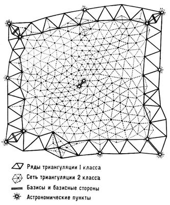Государственная триангуляция в СССР делится на 4 класса (рис.). Государственная Т. СССР 1-го класса строится в виде рядов треугольников со сторонами 20—25 км, расположенных примерно вдоль меридианов и параллелей и образующих полигоны с периметром 800—1000 км. Углы треугольников в этих рядах измеряют высокоточными теодолитами, с погрешностью не более ± 0,7". В местах пересечения рядов Т. 1-го класса измеряют базисы при помощи мерных проволок (см. Базисный прибор), причём погрешность измерения базиса не превышает 1 : 1000000 доли его длины, а выходные стороны базисных сетей определяются с погрешностью около 1 : 300 000. После изобретения высокоточных электрооптических дальномеров стали измерять непосредственно базисные стороны с погрешностью не более 1 : 400 000. Пространства внутри полигонов Т. 1-го класса покрывают сплошными сетями треугольников 2-го класса со сторонами около 10—20 км, причём углы в них измеряют с той же точностью, как и в Т. 1-го класса. В сплошной сети Т. 2-го класса внутри полигона 1-го класса измеряется также базисная сторона с указанной выше точностью. На концах каждой базисной стороны в Т. 1-го и 2-го классов выполняют астрономические определения широты и долготы с погрешностью не более ± 0,4", а также азимута с погрешностью около ± 0,5". Кроме того, астрономические определения широты и долготы выполняют и на промежуточных пунктах рядов Т. 1-го класса через каждые примерно 100 км, а по некоторым особо выделенным рядам и значительно чаще.