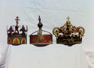 Древние брачные венцы: 1 - железный XVII века, 2 - лубочный XVI века, 3 - резной из дерева, вызолоченный XVII века. Фотография С.М. Прокудина-Горского, 1911 год. Ростов Великий. |